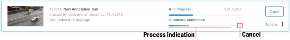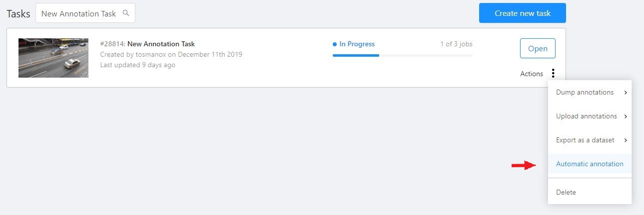 1. To launch automatic annotation, you should open the dashboard and find a task which you want to annotate. Then click the Actions button and choose option Automatic Annotation from the dropdown menu.
