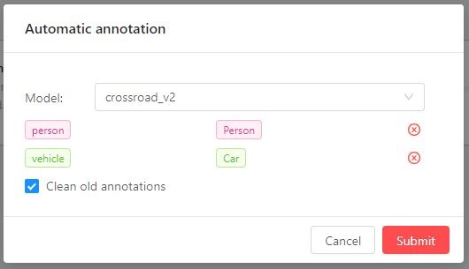 2. In the dialog window select a model you need. DL models are created for specific labels, e.g. the Crossroad model was taught using footage from cameras located above the highway and it is best to use this model for the tasks with similar camera angles. If it’s necessary select the Clean old annotations checkbox. Adjust the labels so that the task labels will correspond to the labels of the DL model. For example, let’s consider a task where you have to annotate labels “car” and “person”. You should connect the “person” label from the model to the “person” label in the task. As for the “car” label, you should choose the most fitting label available in the model - the “vehicle” label. The task requires to annotate cars only and choosing the “vehicle” label implies annotation of all vehicles, in this case using auto annotation will help you complete the task faster. Click Submit to begin the automatic annotation process.