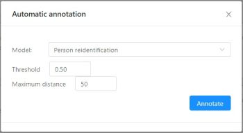 5. You can combine separate bounding boxes into tracks using the Person reidentification model. To do this, click on the automatic annotation item in the action menu again and select the model of the ReID type (in this case the Person reidentification model). You can set the following parameters: